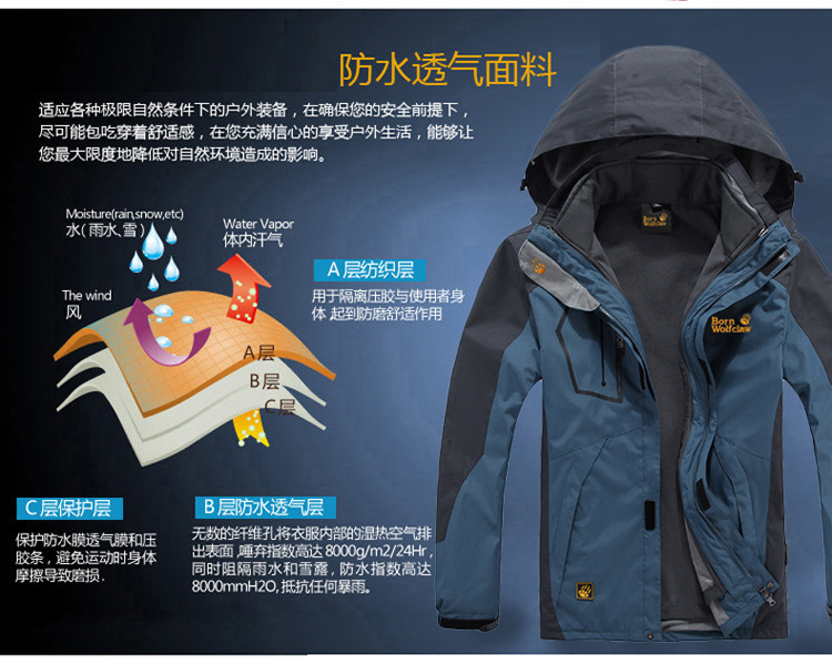 3、防風性。100%防止空氣冷卻效果。在多變的自然環(huán)境中,夾克不應該讓冷風穿透我們的衣服,吹走皮膚附近的溫暖空氣。專業(yè)的夾克應該在中下部有防風裙,或者防風腳,防止風從下擺灌進夾克,還有內置的防風帽,需要的時候可以隨時拿出來戴上。