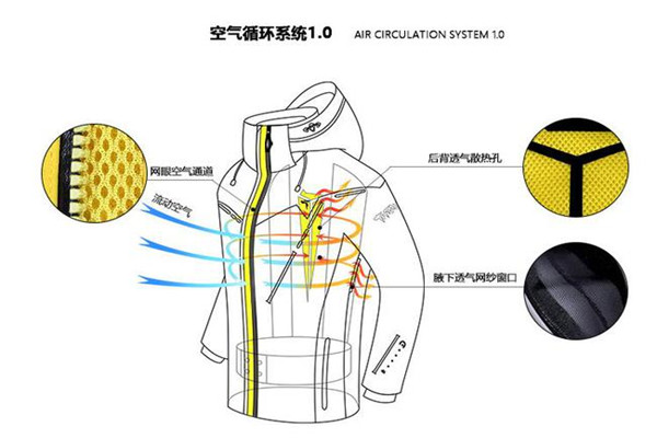 空氣循環(huán)系統(tǒng)1.0:可調節(jié)雙門襟設計,在滑雪時根據(jù)情況自由切換 寒冷天氣下需要保留體內熱量時,閉合第一道拉鏈 在劇烈運動大量出汗時,使用空氣循環(huán)拉鏈,空氣從過濾網眼中進入衣內,空氣開始循環(huán),排出體內多余熱量;通過腋下透氣窗口將衣內多余的熱量排出體外。 如下圖所示: