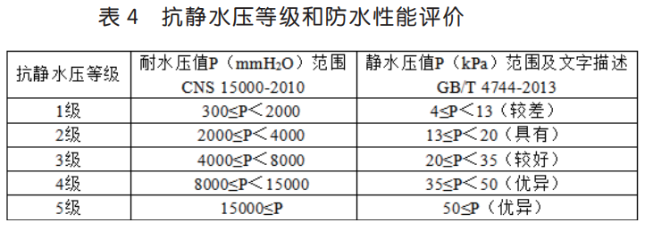可見,防水透濕面料倒杯 - 蒸發(fā)法的透濕率基本符合正態(tài)分布,≤ 4000g/(m2·24h)的比例為10.0%,> 10000g/(m2·24h)的比例 10.0%,一半以上測試結(jié)果集中在 5000~ 9000 g/(m2·24h)。而靜水壓測試結(jié)果相對比較分散,≤ 30kPa 的比例為 16.0%,> 170kPa 的比例為 12.0%,70% 以上的測試結(jié)果大于 70kPa。以 GB/T 32614-2016《戶外運動服裝 沖鋒衣》中對沖鋒衣面料 I 級功能性要求而言,即洗滌前透濕率≥ 5000g/(m2·24h),靜 水 壓 ≥ 50kPa,50 塊 面 料 透 濕 率 合 格 率 為84.0%,靜水壓合格率為 82.0%,合格率基本一致。但靜水壓指標相對更好,三分之二的樣品靜水壓> 100kPa,遠遠滿足標準要求,這也驗證了靜水壓指標通過在織物表面的涂層處理很容易符合標準要求。將 GB/T 4744-2013《紡織品 防水性能的檢測和評價 靜水壓法》及臺灣標準 CNS 15000-2010《防水透濕紡織品性能評估》[8] 對靜水壓的評價性能列如表 4 所示。