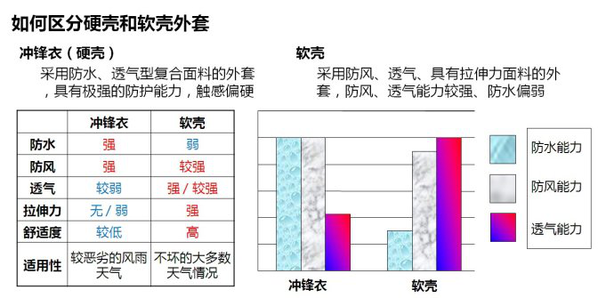 下面從一張圖區(qū)別硬殼軟殼沖鋒衣,簡單來說硬殼更加戶外專業(yè),功能性更強,適合戶外活動穿;而軟殼是在原有保暖防風面料上增添一個防水層,功能性差一些,但同樣具備防水性能,適合日常交際穿著。