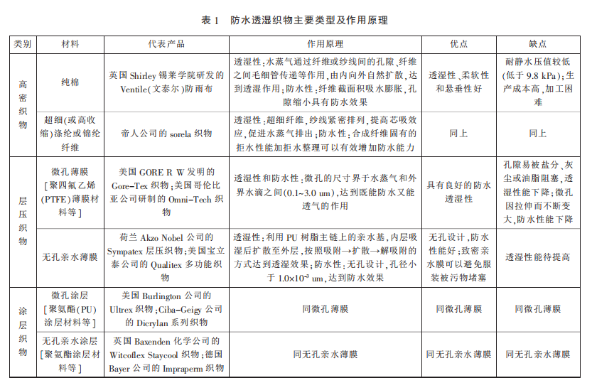 優(yōu)質(zhì)防水透濕面料可以在一定水壓下不被雨水潤濕或滲透,同時將人體散發(fā)的汗液蒸汽擴(kuò)散或傳導(dǎo)到外界,降低人體微氣候區(qū)的濕度,增強(qiáng)穿著的舒適度和安全性。自1940年,研制出第一個防水透濕織物,目前,防水透濕面料已獲長足發(fā)展。根據(jù)加工工藝,防水透濕面料可分為高密織物、層壓織物和涂層織物,見表1。