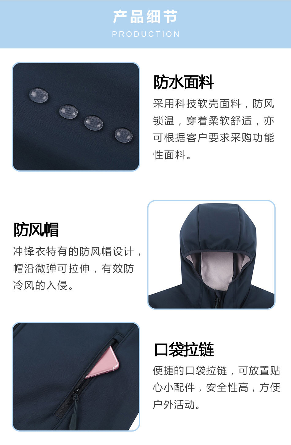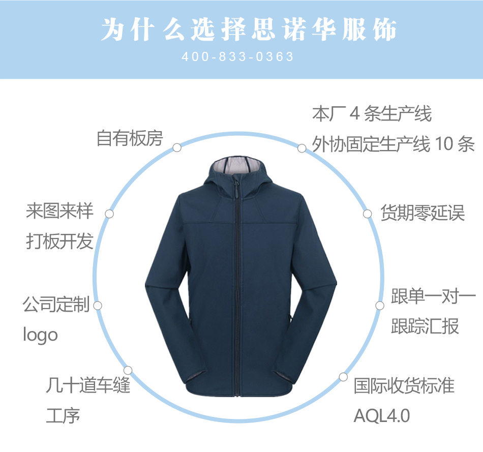 防水面料:采用科技軟殼面料,防風鎖溫,穿著柔軟舒適,亦可根據客戶要求采購功能性面料。