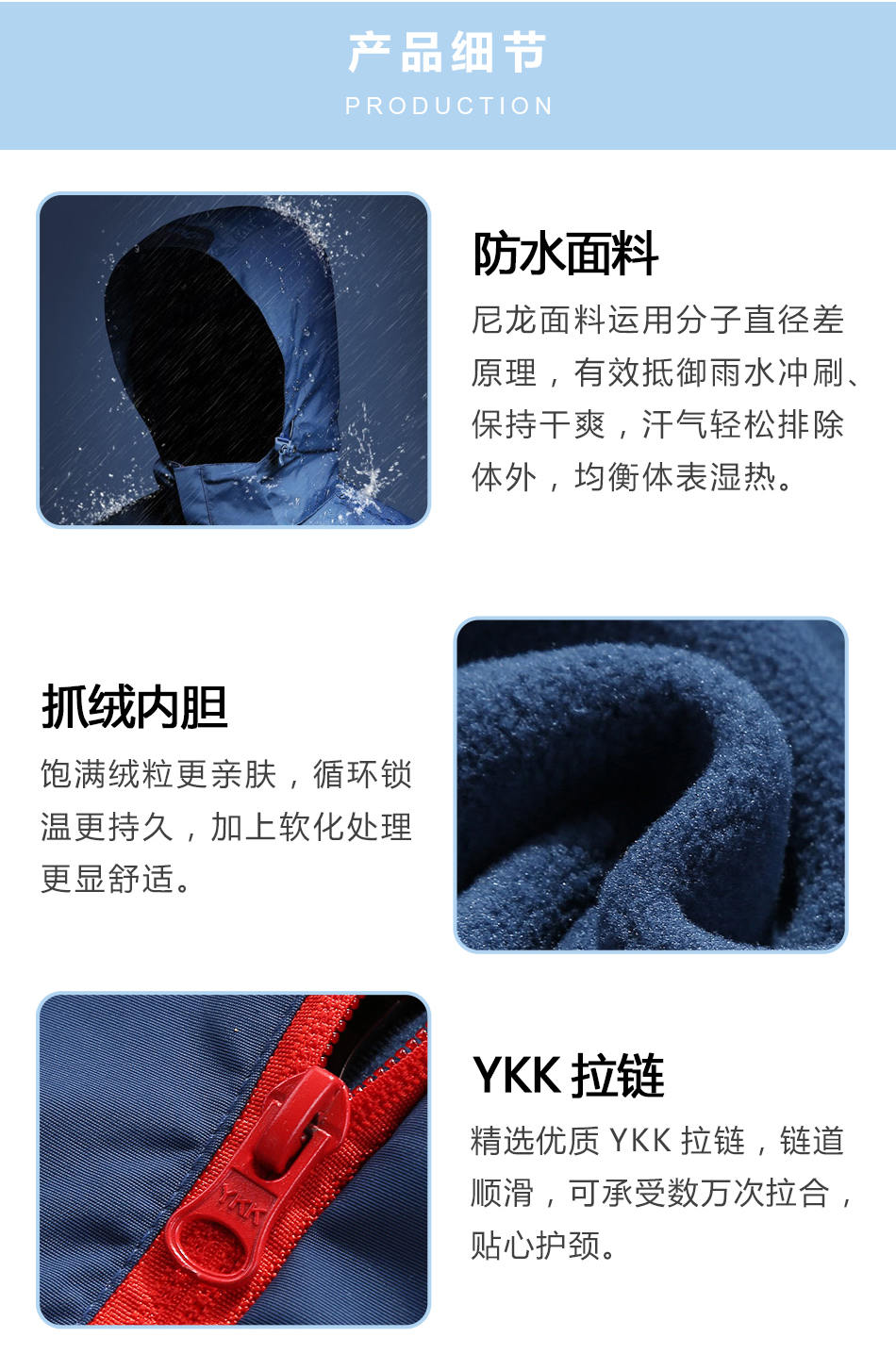 • YKK拉鏈:精選優質YKK拉鏈,鏈道順滑,可承受數萬次拉合,貼心護頸。