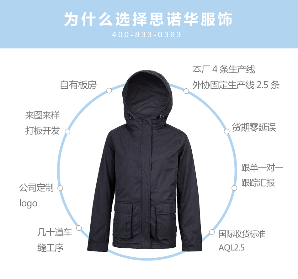 帽子設計:帽子上貼心防風抽繩小配件,均可根據客戶的要求進行戶外風衣套裝定制其特殊配件,防止冷風侵入。