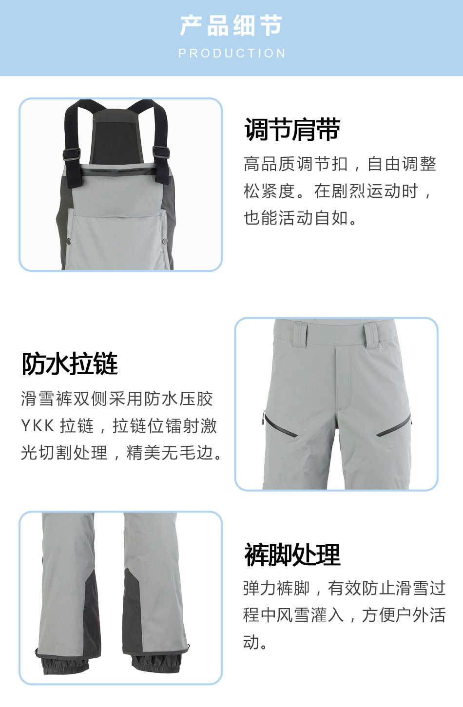防水拉鏈:滑雪褲生產(chǎn)的雙側(cè)采用防水壓膠YKK拉鏈,拉鏈位鐳射激光切割處理,精美無(wú)毛邊。