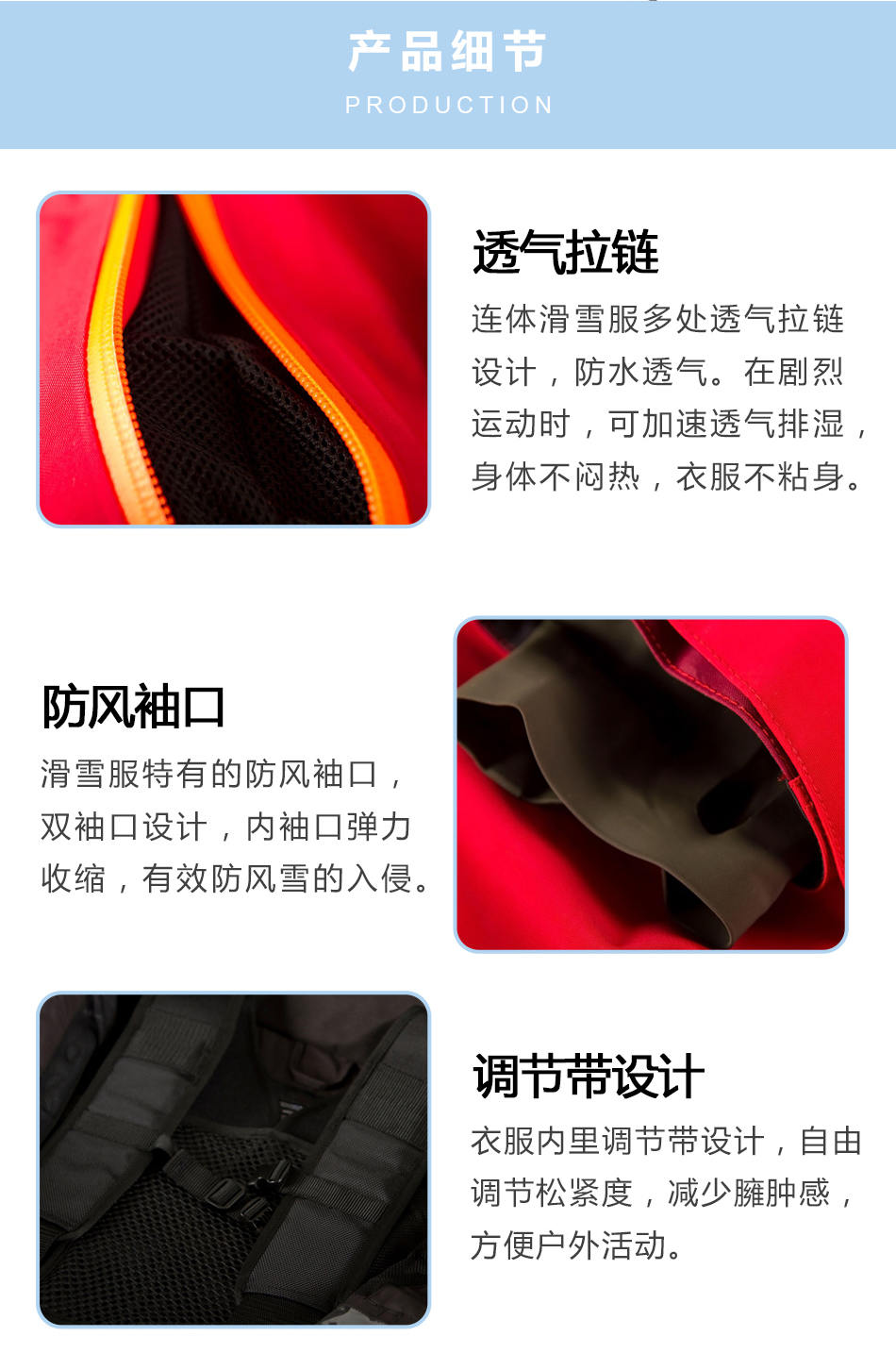 透氣拉鏈:連體滑雪服多處透氣拉鏈設計,防水透氣。在劇烈運動時,可加速透氣排濕,身體不悶熱,衣服不粘身。