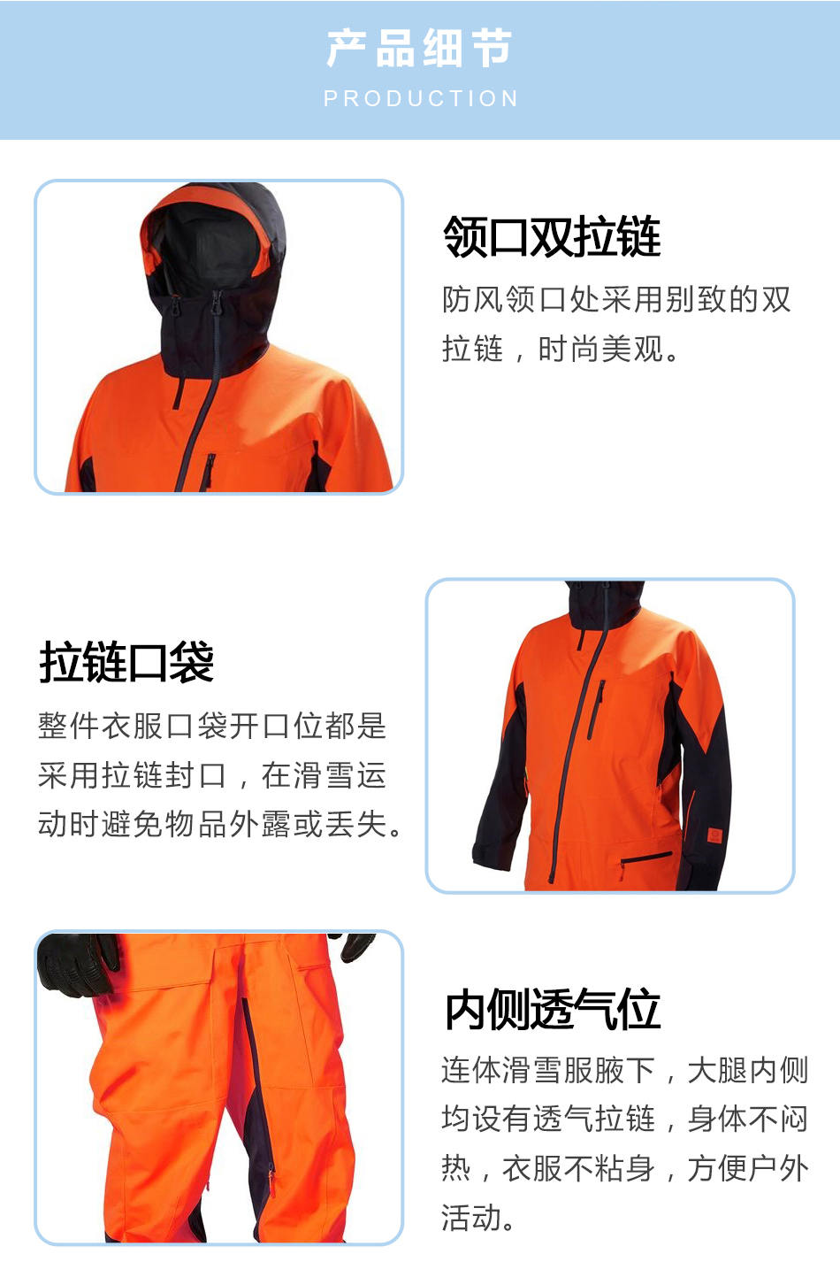 內側透氣位:連體滑雪服腋下,大腿內側均設有透氣拉鏈,身體不悶熱,衣服不粘身,方便戶外活動。